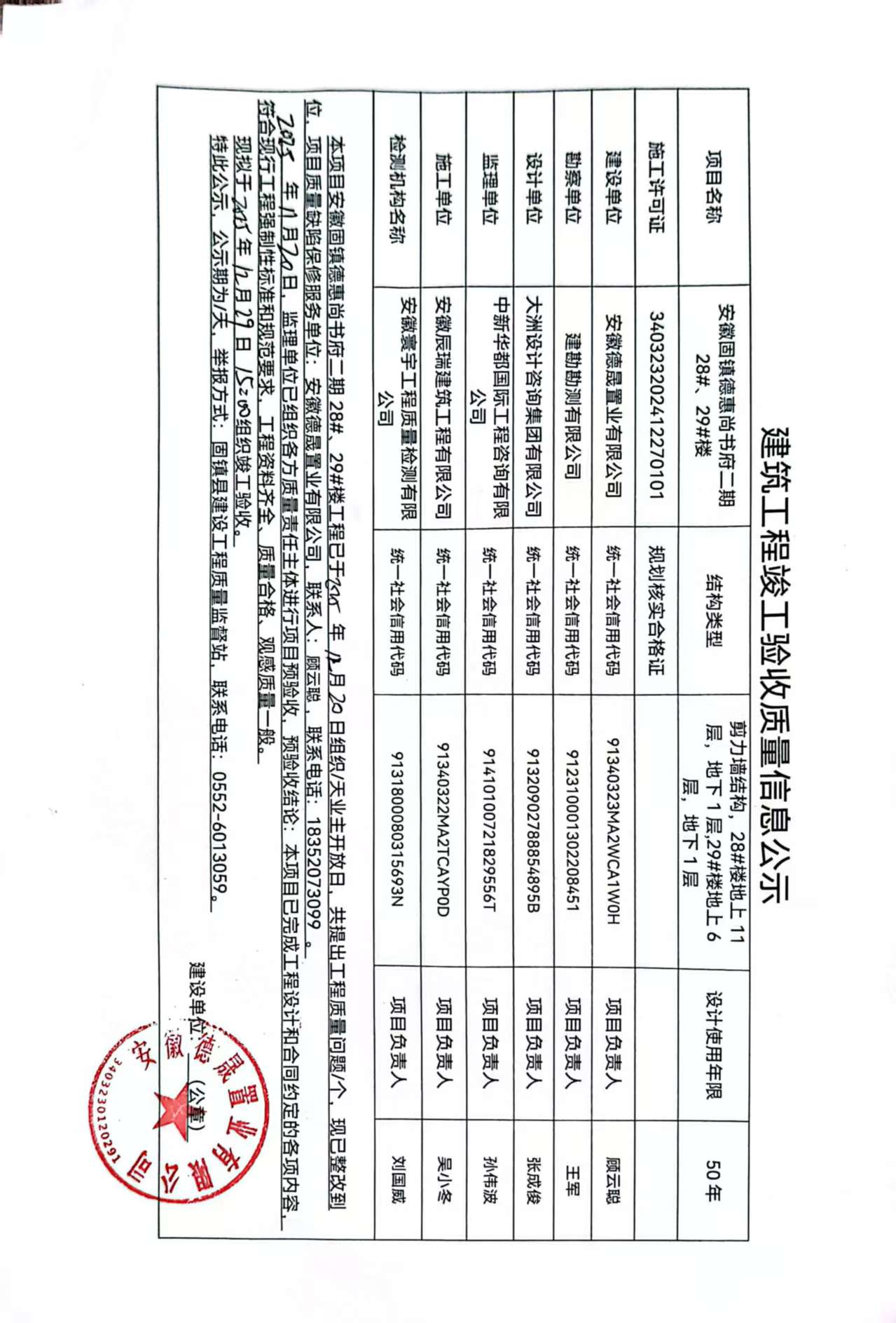 安徽固鎮(zhèn)德惠尚書府二期28、29#樓建筑工程竣工驗收質(zhì)量信息公示