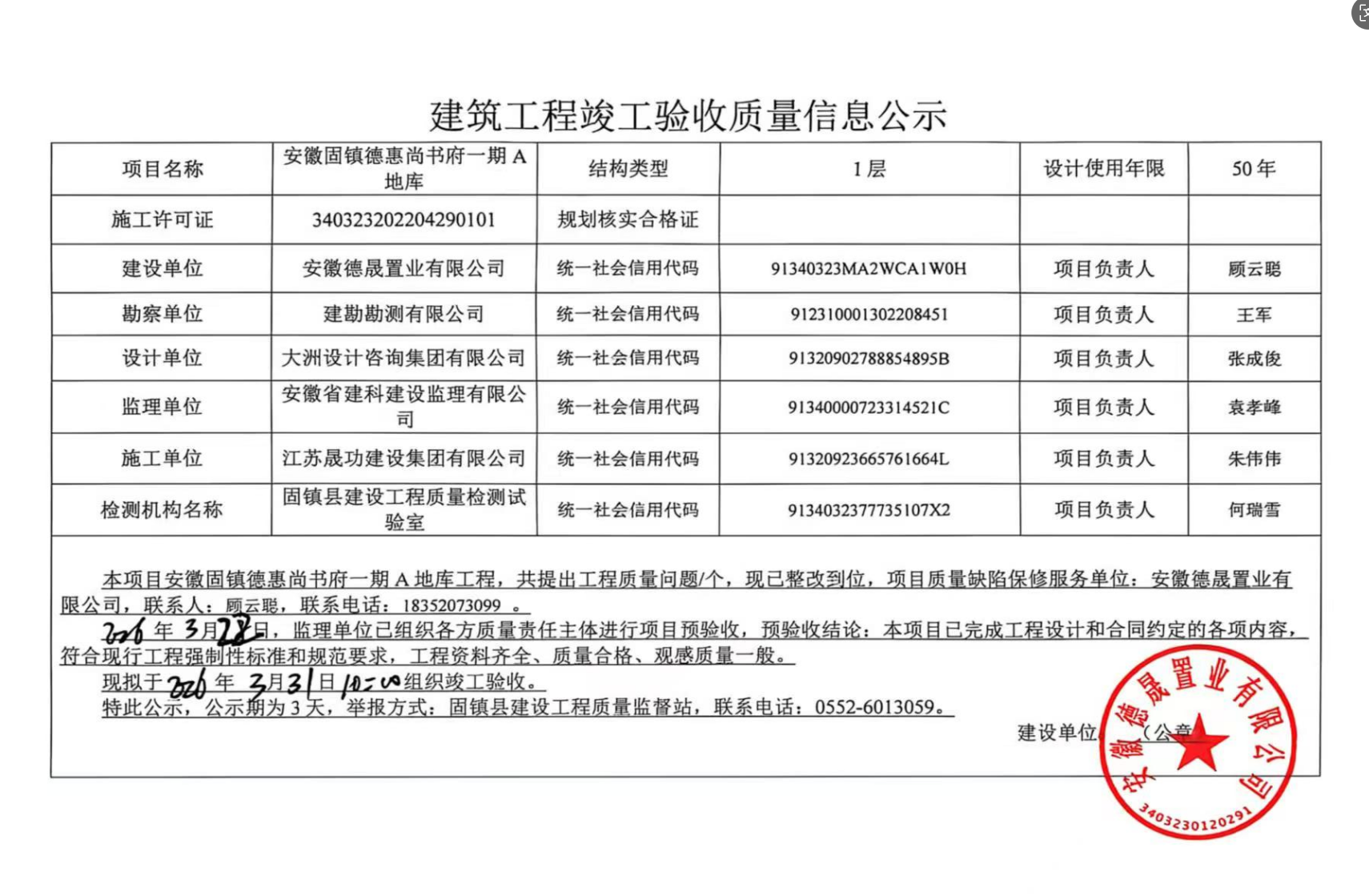 安徽固鎮(zhèn)德惠尚書府一期A地庫(kù)工程竣工驗(yàn)收質(zhì)量信息公示